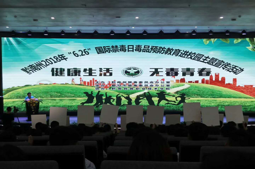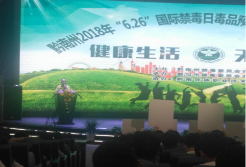 在“安生月”期间、第31个国际禁毒日到来之际,学院联合州、市禁毒办于2018年6月21日下午,举办了2018年“6.26”国际禁毒日毒品预防教育进校园主题宣传活动。学院党委副书记韦永革、州公安局禁毒支队政委杨昌吉(州禁毒办副主任)、州公安局禁毒支队情报科科长胡建武、都匀市禁毒办专职副主任张政权、都匀市公安局绿茵湖派出所教导员黄子芹(学院法制辅导员)、都匀市公安局特巡警大队副大队长韩吉、水家音乐知名人士韦明华、苗家歌手阿桑妮以及黔南师院20多名禁毒自愿者到场参加了活动,参加活动的还有400余名各系学生代表。