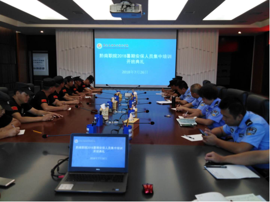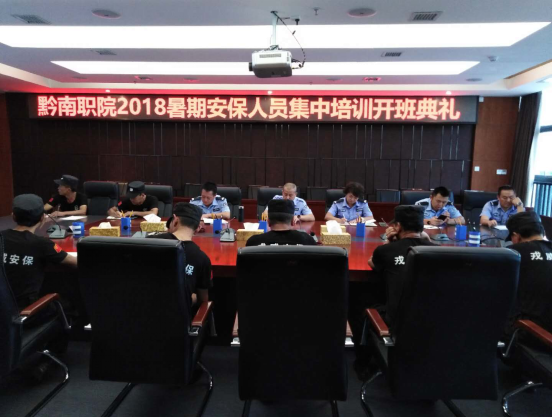 为进一步提升校园安保人员应急处置能力,增强应对突发事件的专业技能,根据《黔南职院2018年暑期安保人员集中培训方案》,于7月26日上午举行了2018年暑期安保人员培训班开班典礼。保卫处负责人林俊主持开班典礼,分管领导韦永革副书记出席开班典礼并作了培训动员。韦副书记向全体安保人员阐述了“全员育人、全程育人、全方位育人”的重要性,指出凡是在学院工作的人,都肩负着教育学生的责任,都是学生的老师,要求大家要随时注意个人形象,不断提升个人素质,以实际行动引导、教育好学生。希望大家珍惜培训机会,做到克服困难、认真学习和训练,加强团结、互相帮助,提高安保专业能力,维护学校安全稳定。