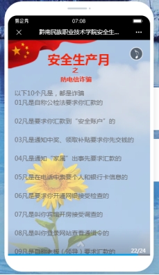 为深入学习习近平总书记关于安全生产重要论述,强化领导干部“人民至上、生命至上”理念,更好统筹发展和安全,切实把安全责任扛在肩上、落在行动上,以实际行动和实际效果做到“两个维护”。深化“落实安全责任 推动安全发展”主题,帮助师生丰富安全常识,增强隐患意识,提升避险能力,全面推进安全发展理念进校园。结合现阶段疫情防控要求,学院于6月16--25日开展了线上“安全宣传咨询日”活动。活动内容包括:观看《生命重于泰山》专题纪录片;学习《安全生产法》、《贵州省安全生产条例》、《黔南州党政领导干部安全生产责任制实施办法》;各系组织学生学习防范性侵、大学生用电安全常识、大学防骗小常识、防溺水安全知识、火灾逃生自救知识、道路交通事故应急知识;使用手机观看《黔南职院“安全生产月”宣传微视频》。