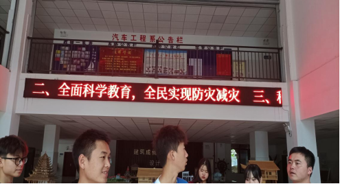一、张挂宣传横幅、更新宣传栏。5月11日,在人流量较大的会计实训楼、建筑大楼的LED屏上滚动播放宣传标语。更新了宿舍区安全宣传栏内容。