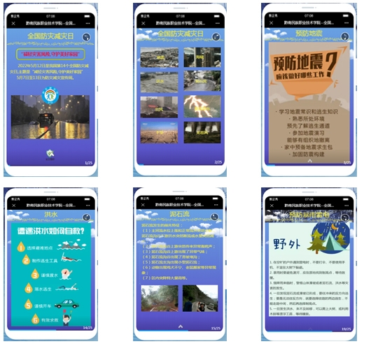 二、制作防灾减灾宣传小视频。5月10日,制作了防地震、防雷电、防洪水、防泥石流等内容的宣传小视频,发放到各系各班供学生用手机观看。