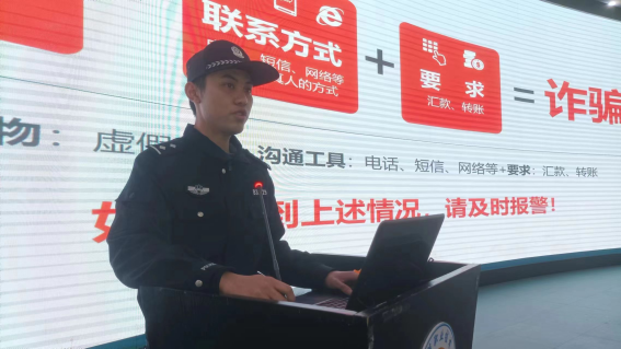 为进一步增强学生防范电信网络诈骗的意识和技能,保护自身财产安全,学院邀请都匀市公安局绿茵湖派出所刘所长、片区民警莫警官等一行四人到校,于2023年3月2日下午在知行楼学术报告厅为320余名各系师生代表举办了一场“防范电信网络诈骗”专题讲座。讲座中,刘所长首先为各系师生代表讲述举办这次讲座的目的和作用。其次,莫干警从什么是电信网络诈骗、诈骗的手段和方法有哪些、受骗案例、如何防范等方面进行了详细讲解。最后,一名学生上台分享了如何防范网络电信诈骗的心得体会。整场讲座学生纪律较好,会场气氛热烈、场面活跃。