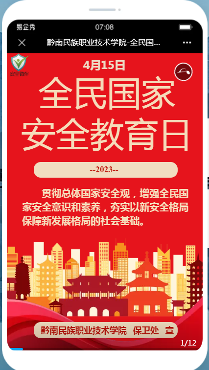 根据州教育局《关于印发〈全州教育系统2023 年全民国家安全教育日活动方案〉的通知》要求,学院于 2023年4月8--16日,以“贯彻总体国家安全观,增强全民国家安全意识和素养,夯实以新安全格局保障新发展的社会基础。”为主题,认真组织开展了全民国家安全教育日系列宣传活动。