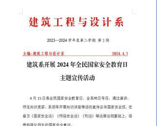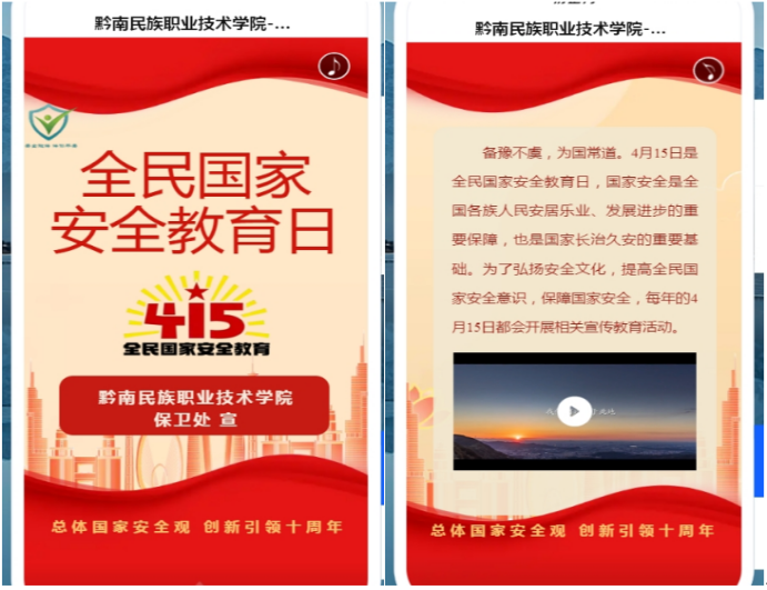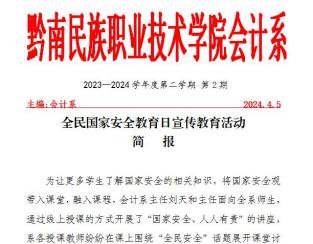 2024 年是习近平总书记提出总体国家安全观 10 周年,4 月 15 日是第九个全民国家安全教育日。为深入贯彻落实习近平总书记关于加强国家安全教育的重要指示精神,推动国家安全宣传教育工作深入开展,强化广大师生加深对“总体国家安全观”的理解和认识,增强师生安全意识,根据《全州教育系统2024年全民国家安全教育日活动方案》要求,结合学院实际,按贴近实际、贴近生活、贴近学生原则,组织开展了一系列国家安全教育日宣传教育相关活动。