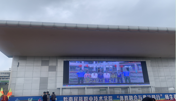 ▲利用运动场电子大屏轮番播放贵州省防灾减灾宣传视频