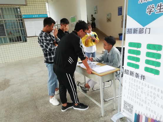 图1 2019级的同学们在学生会报名点咨询并报名 图2 系学生管理办公室主任韦仲园讲话