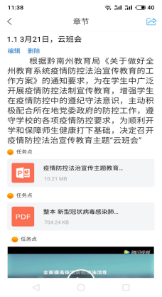 此次“云班会”,将“疫情防控法治宣传教育”作为网络教学重要内容,各班使用超星学习通,班主任进行主讲,通过视频、PPT课件、文档、图片、组织同学们进行讨论、小测试等达到宣传教育的目的,要求同学们遵守学校的相关规定,不允许提前返校,每天要按照课表准时上课。要求同学们每天及时向班主任反馈自己的健康情况及出行情况。收集课堂信息,联系每一位不能按时上课的学生,并给予一对一的教学帮助。