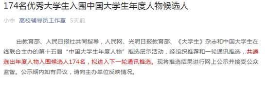 2020年8月15日,由教育部、人民日报社共同指导,人民网、光明日报教育部、《大学生》杂志和中国大学生在线联合主办的第十五届“中国大学生年度人物”推选展示活动,经组织推荐和一轮通讯推选,共遴选出年度人物入围候选人174名,拟进入下一轮通讯推选,我系2018级电子商务专业刘道敏同学成功入围第十五届“中国大学生年度人物”候选人。