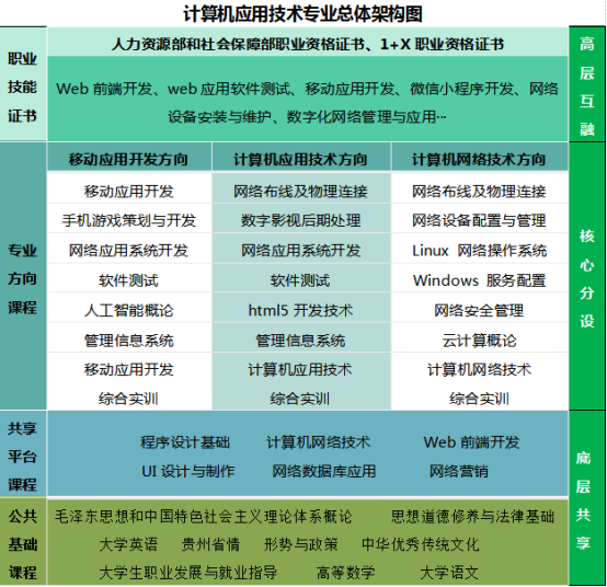计算机应用技术专业是计算机信息管理专业整合计算机网络技术专业,结合产业发展需要更名的专业。开设于2001年,是中央财政支持建设专业,贵州省优质高职院校建设专业,贵州省骨干专业,教育部认定国家级骨干专业;是贵州省27个产业链中的大数据产业、电子信息产业主要参与建设专业;是“双高计划”重点建设计算应用专业群核心专业;全面推进专业建设,争取早日成为职业本科专业。开设有计算机应用技术、移动应用开发和计算机网络技术3个专业方向,目前在校生893人。本专业对接贵州省十大千亿级产业之一“大数据电子信息”产业,面向新一代信息技术产业,瞄准互联网和相关服务、软件和信息技术服务业软硬件技术支持、软件硬件维护、软件开发、软件测试、网络规划搭建、网络技术支持、软硬件推广销售等岗位群,培养德、智、体、美、劳全面发展“精维护、能开发、会运营”的素质高、技能强、复合型、双创型人才。