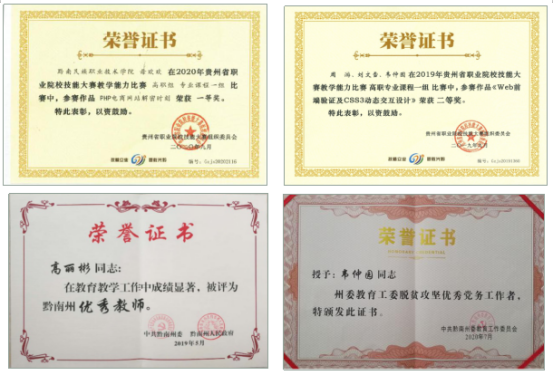 专业现有专兼职教师24名,其中,专任教师20名、企业兼职教师4名,副教授以上10名,博士1名,研究生8名;“双师型”教师17名,占专任教师的77%。6名教师是黔南州大数据专家, 4名教师是贵州省电子商务百名讲师团成员。近三年获黔南州优秀教师1名,优秀教育工作者2名,脱贫攻坚表彰3名;参加国家教学能力大赛获三等奖1项,参加贵州省教学能力大赛获一等奖1项,二等奖2项,三等奖2项。