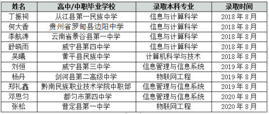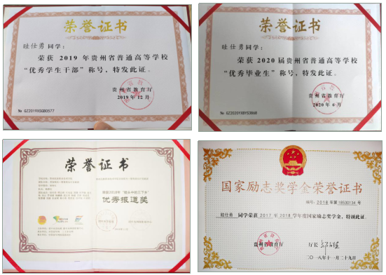 眭仕勇,男,中共党员,2020届计算机信息管理专业毕业生,来自精准扶贫户家庭。从瓮安中等职业技术学校毕业后考入我校,进校后一直担任班级团支部书记,后当选为大数据系团总支副书记,担任学生干部期间,积极配合完成各项工作任务。在大学期间积极参加各项活动和比赛,获得贵州省普通高等学校优秀学生干部称号、全省大学生暑期“三下乡”社会实践活动先进个人称号、贵州省职业院校技能大赛“三等奖”等累计获奖近20项。2019年他以在校生的身份注册成立贵州网梦云计算机信息服务有限公司,并担任执行董事;2020年,参加专升本考试成功被本科院校录取;2020年,积极响应国家号召报国从军,成功应征入伍。
