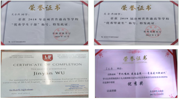 吴金燕,女,中共党员,2019届计算机信息管理专业毕业生,从余庆县他山中学毕业后考入我校,进校后一直担任班级班长,后当选为大数据系团总支副书记,担任学生干部期间,积极配合完成各项工作任务。在大学期间积极参加各项活动,获得贵州省普通高等学校优秀学生干部称号、贵州省普通高等学校“优秀毕业生”称号,黔南州“优秀共青团员”称号等奖项10余项。2018年被学院选派赴波兰琴斯托霍瓦师范大学微留学顺利结业;2019年毕业后留校担任辅导员,获得广大师生喜爱。