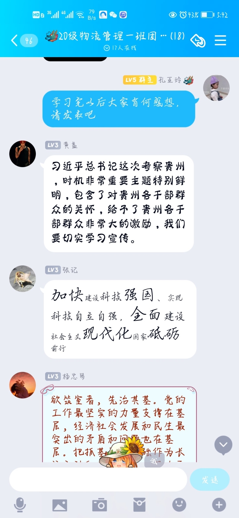会上,各团支书带领青年团员认真领学“学习贯彻习近平总书记视察贵州重要讲话精神”的相关文件、观看相关视频,并组织大家积极开展讨论、交流。