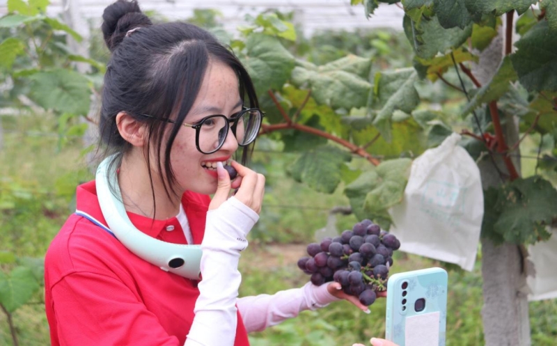 图为服务队员在葡萄种植基地开展直播
