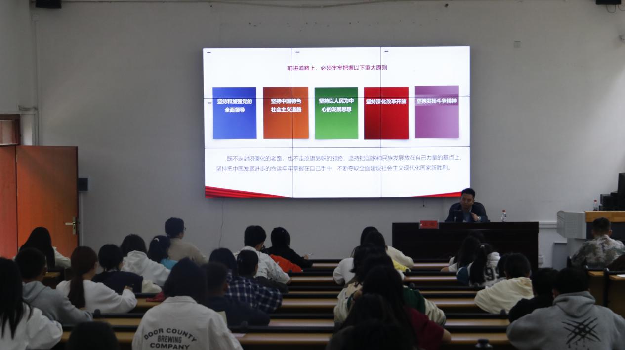 江屹围绕党的二十大的主题、过去5年工作和新时代10年的伟大变革等九个方面进行了宣讲,带领大家学习领会党的二十大的主要内容和精神内涵,为大家上了一堂生动的思政大课。宣讲过程中江屹用饱含深情、语重心长的话语鼓励我系学子要自信、肯奋斗、不躺平,认真规划工作和学习,紧贴专业、不断潜心钻研、突破自我,敢担当、不空谈,认真审时度势,树立远大理想,自觉担当重任,在全面建设社会主义现代化国家新征程上勇毅前行。