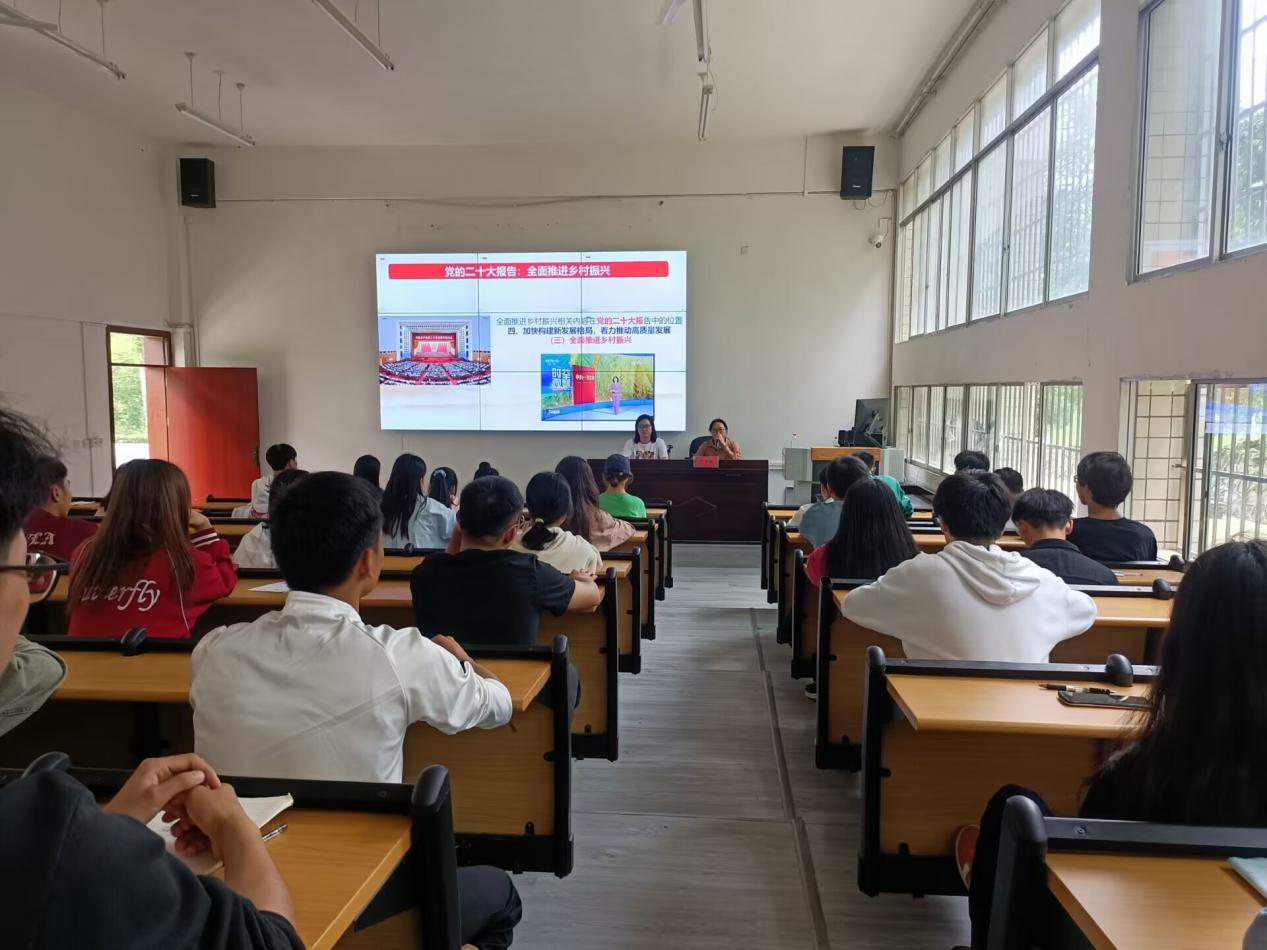 李然首先带领同学们学习了党的二十大报告中关于全面推进乡村振兴的重要内容。接着,刘芳梅结合自身经历,以扶贫干部的故事、当地村民的故事,讲述了自己担任中和镇水龙村驻村第一书记的经历。她勉励青年学生,要摆脱浮躁冒进、偷奸耍滑等不良风气,要爱党、爱国、爱家乡,要老老实实做人、踏踏实实做事,心怀感恩,多做好事、实事,务必要做一个对国家有所贡献的有为青年。