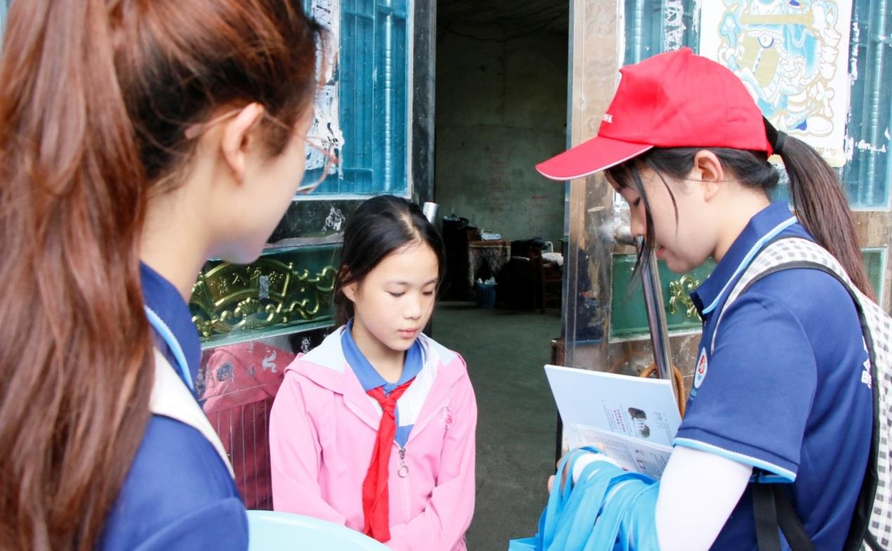 图为乡村振兴服务队志愿者在给小学生作禁毒防艾知识宣传