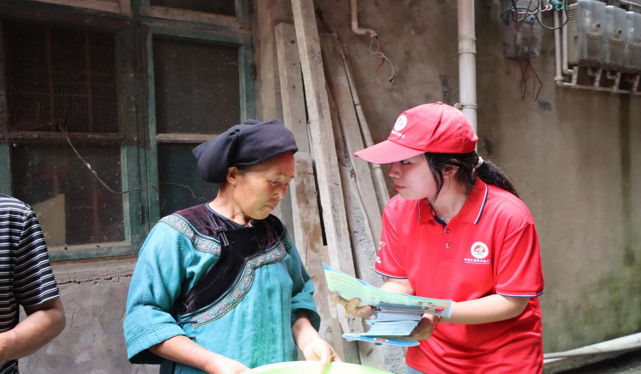 图为志愿者跟当地村民分发宣传单认真讲解