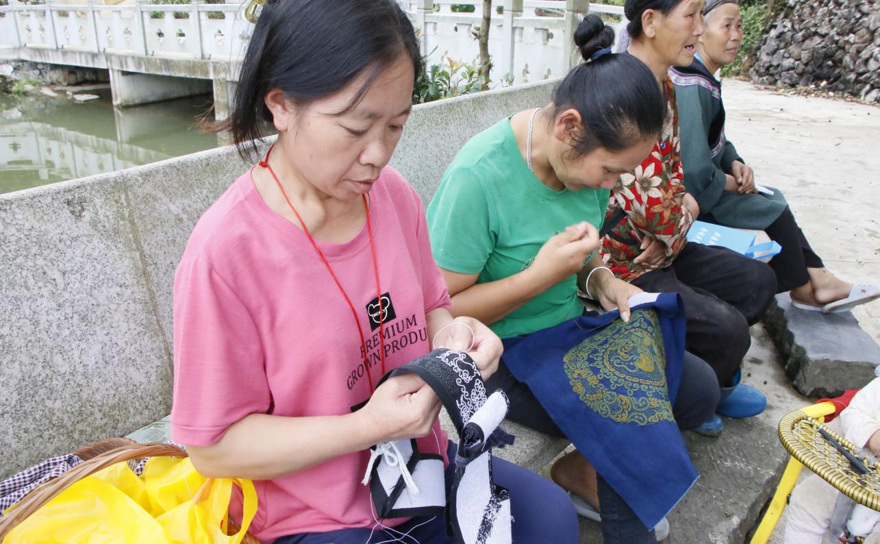 图为村民在一起绣马尾绣、话家常