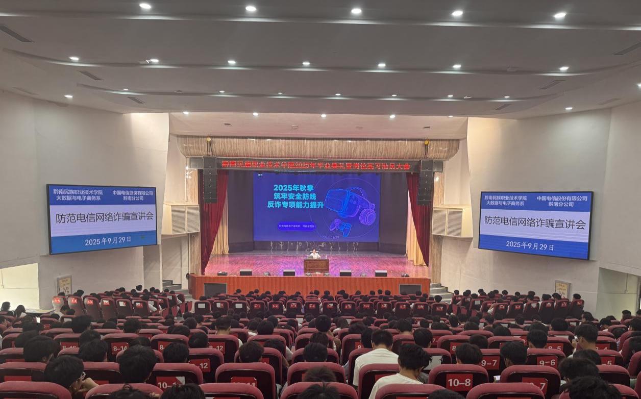 系党总支自上半年与中国电信黔南分公司实施开展“党建翼联”共建活动以来,校企双方以“协同育人”为核心,深化合作、提升实效。9月29日,为帮助我系2025级新生从入学之初就养成网络安全意识,筑牢安全防线,校企再次携手,为全体新同学量身打造“防诈第一课”专题讲座。