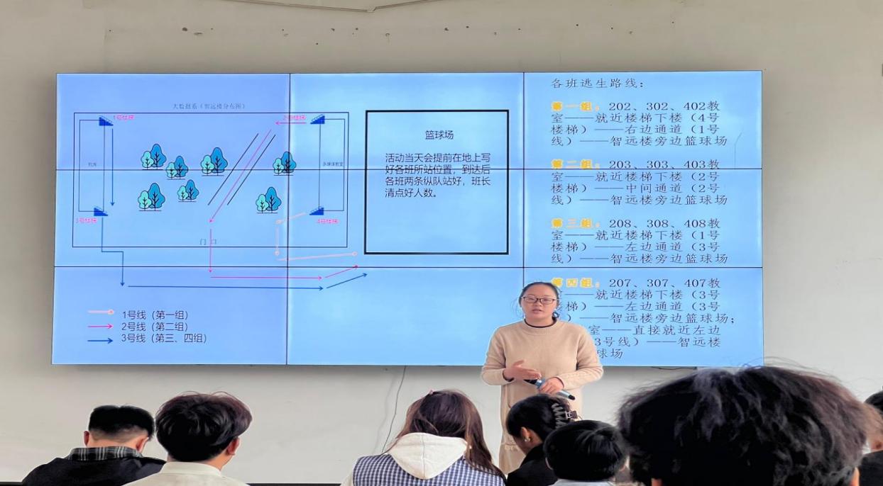 演练开始前,系部首先召开“一场演练,一份安心”紧急疏散演练安排部署会,组织学生认真学习在遇到火灾突发情况的应对知识,并对此次演练活动中的注意事项提出明确要求。当警报声响起,演练正式开始,整个演练过程按照工作方案井然有序进行。