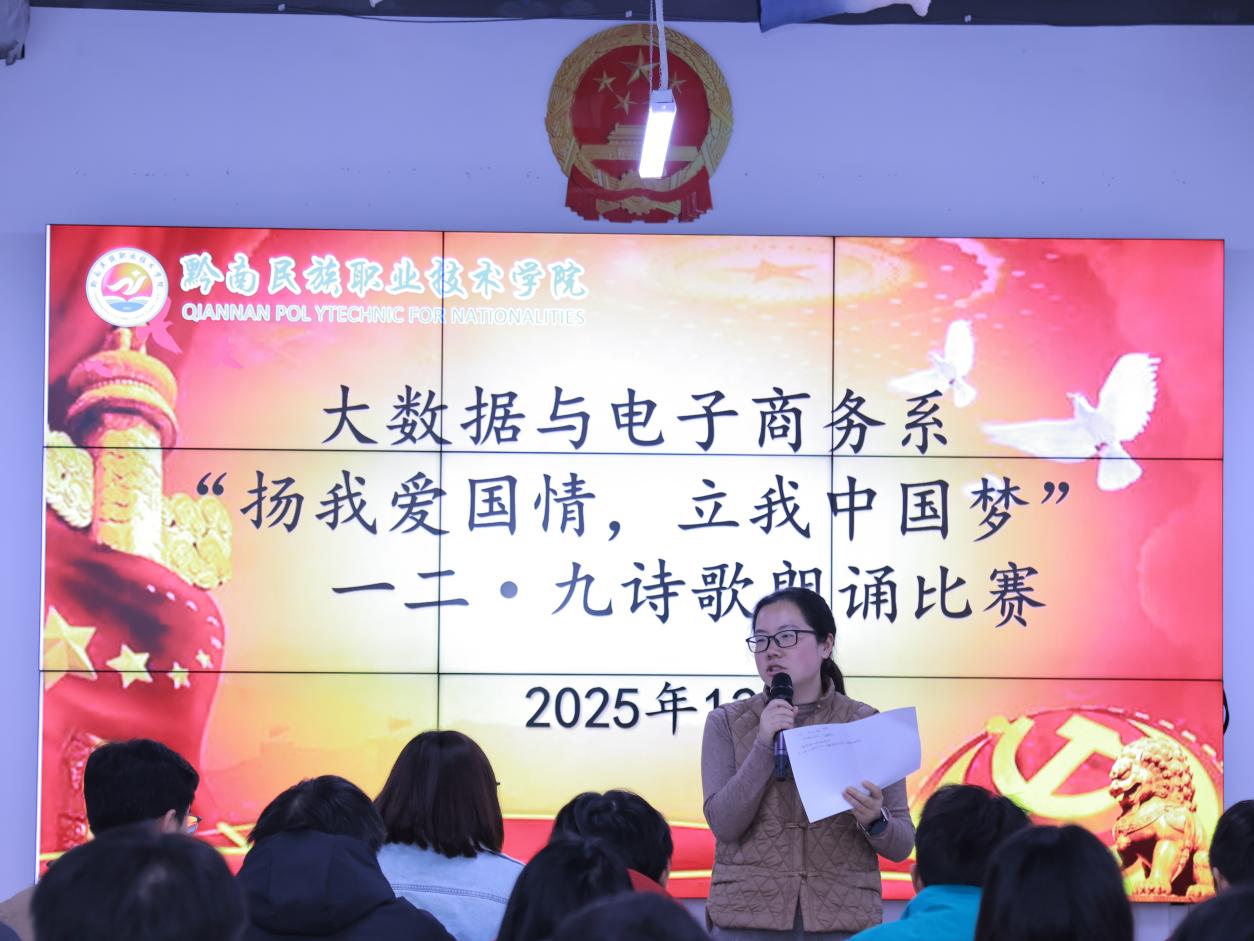 2025年11月25日至12月10日,黔南民族职业技术学院大数据与电子商务系开展“扬我爱国情,立我中国梦”一二·九诗歌朗诵大赛。经初选,10支队伍晋级决赛,12月10日13:00,决赛在6栋宿舍楼下学生活动中心举行,系党总支副书记李然、学管主任刘芳梅及辅导员来到现场,与选手、观众共同参与活动。
