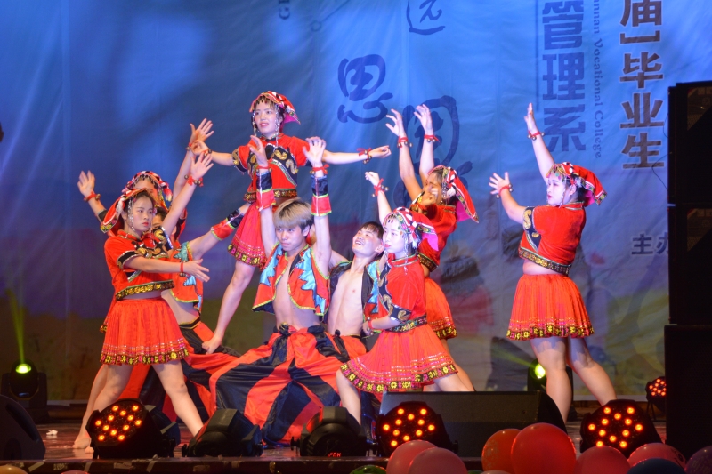 紧接着,主持人宣布开幕,分别以《彷徨》、《呐喊》、《朝花夕拾》、《祝福》四个篇章,歌舞弹唱、茶花书画、小品话剧、民族走秀等16个节目依次精彩纷呈,一首《平凡之路》吉他弹唱热暖全现场,《梦想启航》、《复古爵士》有益结合文秘、社工、旅游管理、人力资源管理及烹饪专业特色特长演绎得淋淋尽致;《竹竿舞》《铃铛舞》《高山秀》展示学院少数民族文化教育和生态教育成效,体现了文化自觉、文化自信。小品《我想找个女朋友》笑点不断,乐翻全场;《屋顶着火》、《lip hip》舞动青春,激情四射,引爆全场,把晚会推向高潮。爱与祝福的《谢师茶、书倾画》,感恩母校,感谢恩师;18届毕业生合唱一首《再见》,青春不散场,挥手致谢,相惜告别。