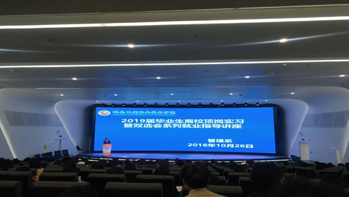为进一步加强和做好毕业生就业指导工作,教育和引导毕业生正确认识当前的就业形势,树立正确的择业观、就业观,努力提高毕业生的就业能力和就业质量, 2018年10月26日管理系邀请学院招生就业处蒙明洲、陈再华二位教师在知行楼一楼学术报告厅为管理系2019届毕业生进行了毕业生顶岗实习暨双选会系列就业指导讲座,来自全系2019届近400余名学生参加此次讲座。