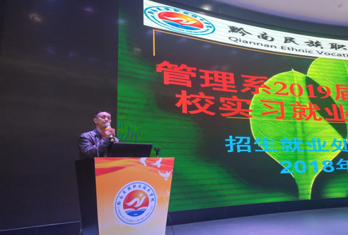 蒙明洲老师先对黔南民族职业技术学院2018年校园“双选会”给同学们做了详细的介绍。讲座中首先从同学们应该怎样跳出心理误区,以积极的心态面对就业方向谈起,并向同学们讲解了大学生就业环境中面对的主要安全问题以及大学生入职安全防范措施。同时为提高我院教育质量,帮助我院学生了解当今的就业形势进行合理、科学的职业生涯规划设计,树立正确的择业观念和学习目标,掌握正确的择业方向,招生就业处的蒙明洲老师对同学们进行了具有针对性的就指导。