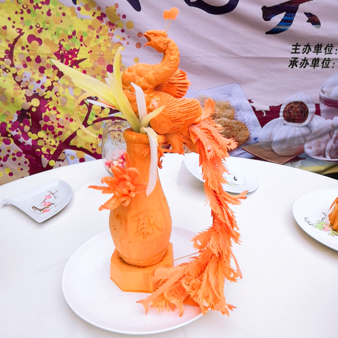 “这是工艺雕刻创作的《孔雀》,这是以烹饪创作的《展翅翱翔》,这是果肉雕刻《瓜雕》,主要想表达我们希望职院发展越来越红火的愿望。”2017级烹饪工艺与营养专业学生张成说。