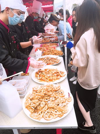 调研中,吴胜华来到该学院管理系正在举办的“第二届校园美食节”大学生创新创业实践活动现场。“领导,请看这是学生主要以工艺雕刻、烹饪、果酱画等方式,设计和创作的中式餐点《戏水螃蟹》、《秋菊图》、《夏日荷花》、《冬梅飘香》,西式甜点《蓝莓慕斯》、《玫瑰巧克力》、《黑森林幽默》……”在该系专业带头人的详细介绍下,吴胜华详细了解学生们的作品设计、烹调工艺。