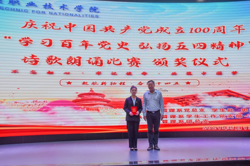 为庆祝中国共产党成立100周年,纪念五四运动102周年,进一步引导我系青年学生学习百年党史,弘扬五四精神,坚定理想信念、投身祖国建设。2021年5月13日,管理系党总支,院学生处、思政部、团委联合举办“学习百年党史 弘扬五四精神”诗歌朗诵比赛。管理系党总支书记沈华、主任邹林、副主任林裕辉,院学生处处长潘奇、思政部负责人滕晓梅、团委书记赵一瑾及相关老师和学生代表参加活动。