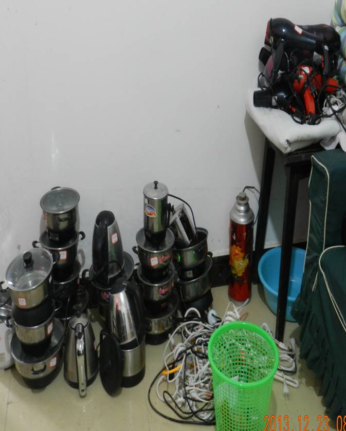 11 月26日 ,为确保冬季校园用电安全,从即日起后勤处、保卫处联合对学生在寝室内使用电热毯、电炉、取暖器、电热水壶、电磁炉、电老虎、大于1千瓦电吹风等大功率电器情况进行检查。检查中发现学生在寝室使用大功率电器现象极为普遍,存在较大安全隐患。检查人员现场收缴了违规使用的大功率电器。事后,后勤处协同各系对违规使用大功率电器学生进行用电安全教育,同时责成学生认领被收缴的电器并承诺不再在校园内使用。