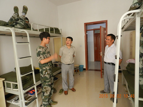 我院第一期3栋公寓楼建设项目于2015年8月底竣工完成。 3栋公寓总建筑面积为20529.9�,占地面积为17100�,地上5层,建筑物总高度为 18m ,共504套房,可入住3000多名学生。9月初,迎来第一批中职新生1000余人入住。下图为院党委罗俊书记和张正荣副院长看望已入住的中职新生,并与学生们进行亲切交谈。