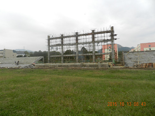 我院南区室外运动场改造工程于2015年5月开工建设,承建单位为广西桂川建设集团有限公司。工程改造项目有:修建主席台面积为211.4�,看台座位为2000座,田径运动场面积为16500�(设置塑胶跑道和其它体育设施),目前运动场工程完成看台主体工程,进行运动场的装饰和施工。