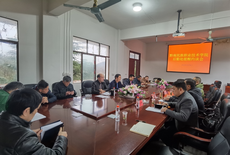 根据学院党委工作安排,3月9日上午,学院在后勤处会议室召开“黔南民族职业技术学院后勤处廉政教育提醒约谈会”,学院党委委员、纪委书记胡成林,学院党委委员、副院长王焱,学院纪委副书记、监察处处长韦超出席会议,后勤处全体职工参会。