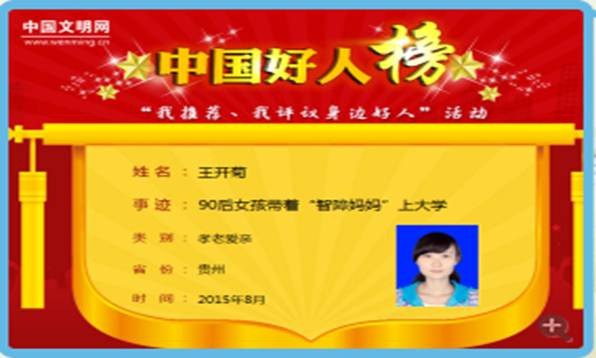 近日,中国文明网讯,由中央文明办主办、中国文明网承办的“我推荐、我评议身边好人”活动8月“中国好人榜”名单揭晓,我院生物系王开菊同学和陈开元、威宁县的谢增发、黔西南州的刘树军、伊亚莉夫妇,以及贵阳市的闫彪6人与全国110位身边好人一起,榜上留名。 本次荣登“中国好人榜”,是她继荣获学院2012至2013学年度“优秀学生干部”,2012至2013学年度学院一等奖学金、助学金, 2014年学院“立志成才十佳大学生”、“优秀春晖服务队员”,共青团黔南州委2015年“五四青年节优秀青年”荣誉称号以及获评2015年黔南州第三届“黔南青年先锋”、2015年“多彩校园.闪亮青春”第十届全省大学生校园文化活动月之“感动校园十大人物”后的再次荣耀。我们相信,她的事迹将为我院广大学子树立道德标杆,激励大家“尊老爱亲”,传递爱心和正能量,书写出彩人生。
