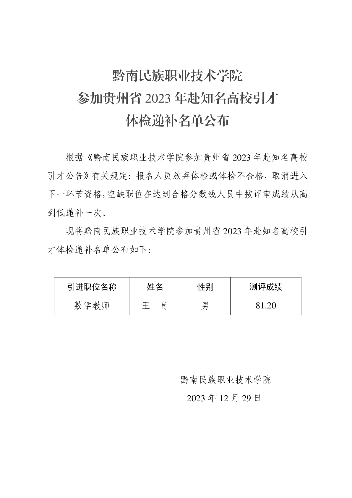 黔南民族职业技术学院参加贵州省2023年赴知名高校引才体检递补名单公布
