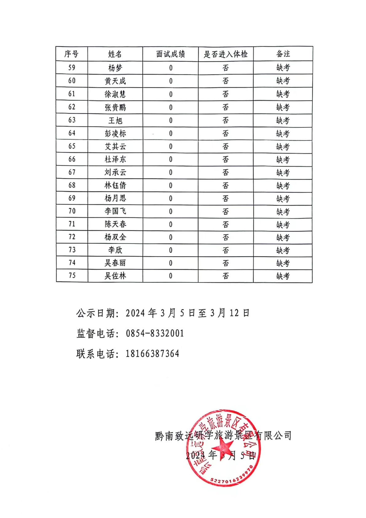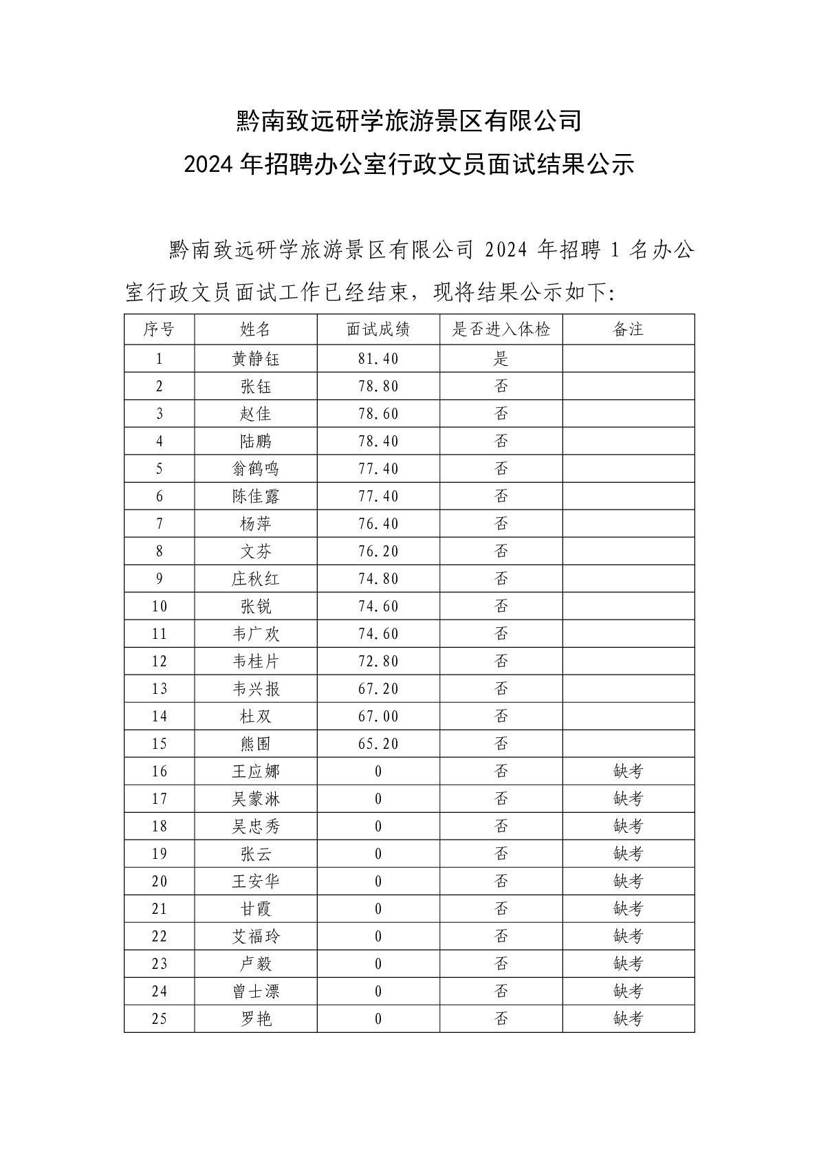 黔南致远研学旅游景区有限公司2024年招聘办公室行政文员面试结果公示