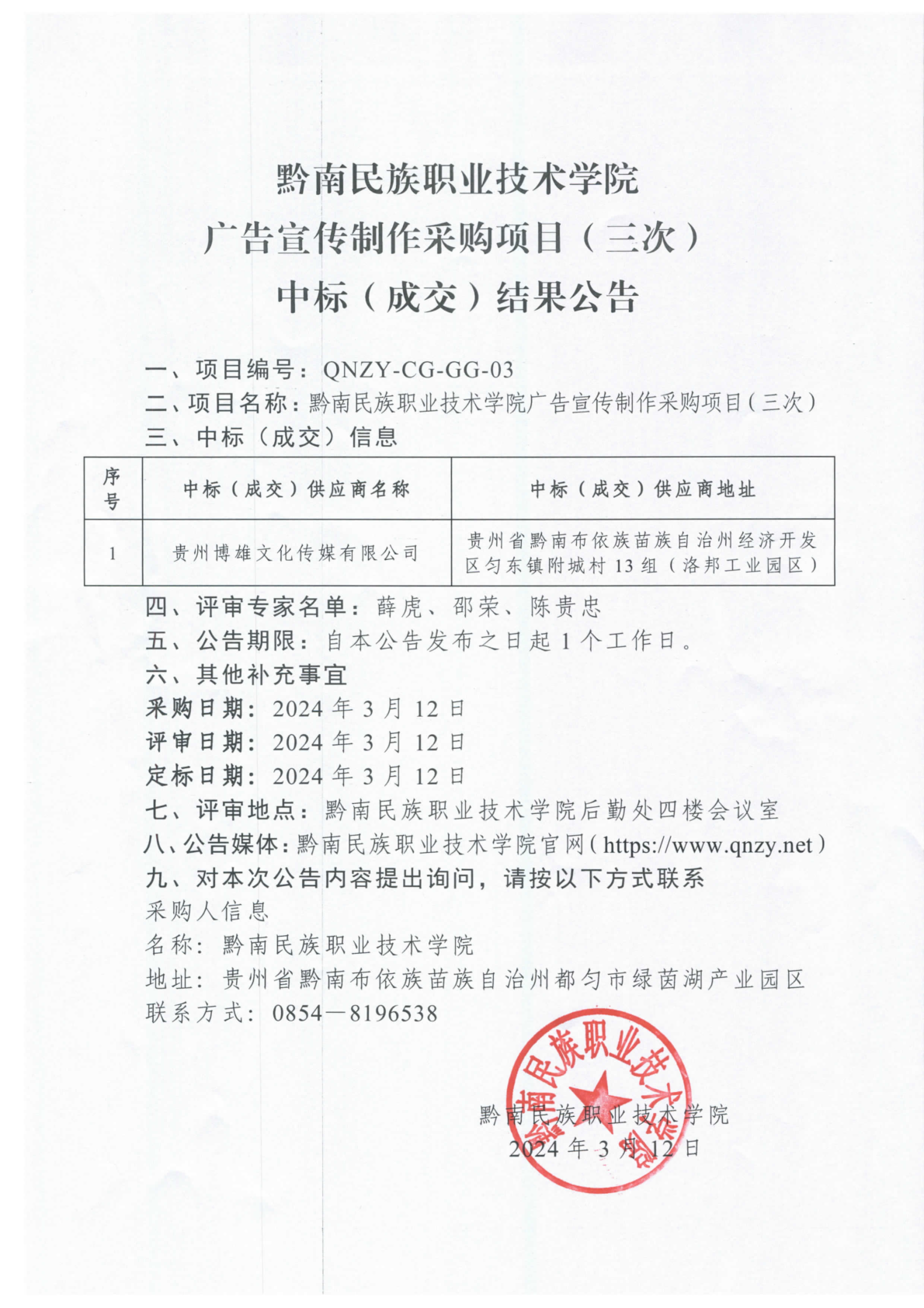 黔南民族职业技术学院广告宣传制作采购项目(三次)中标结果公告