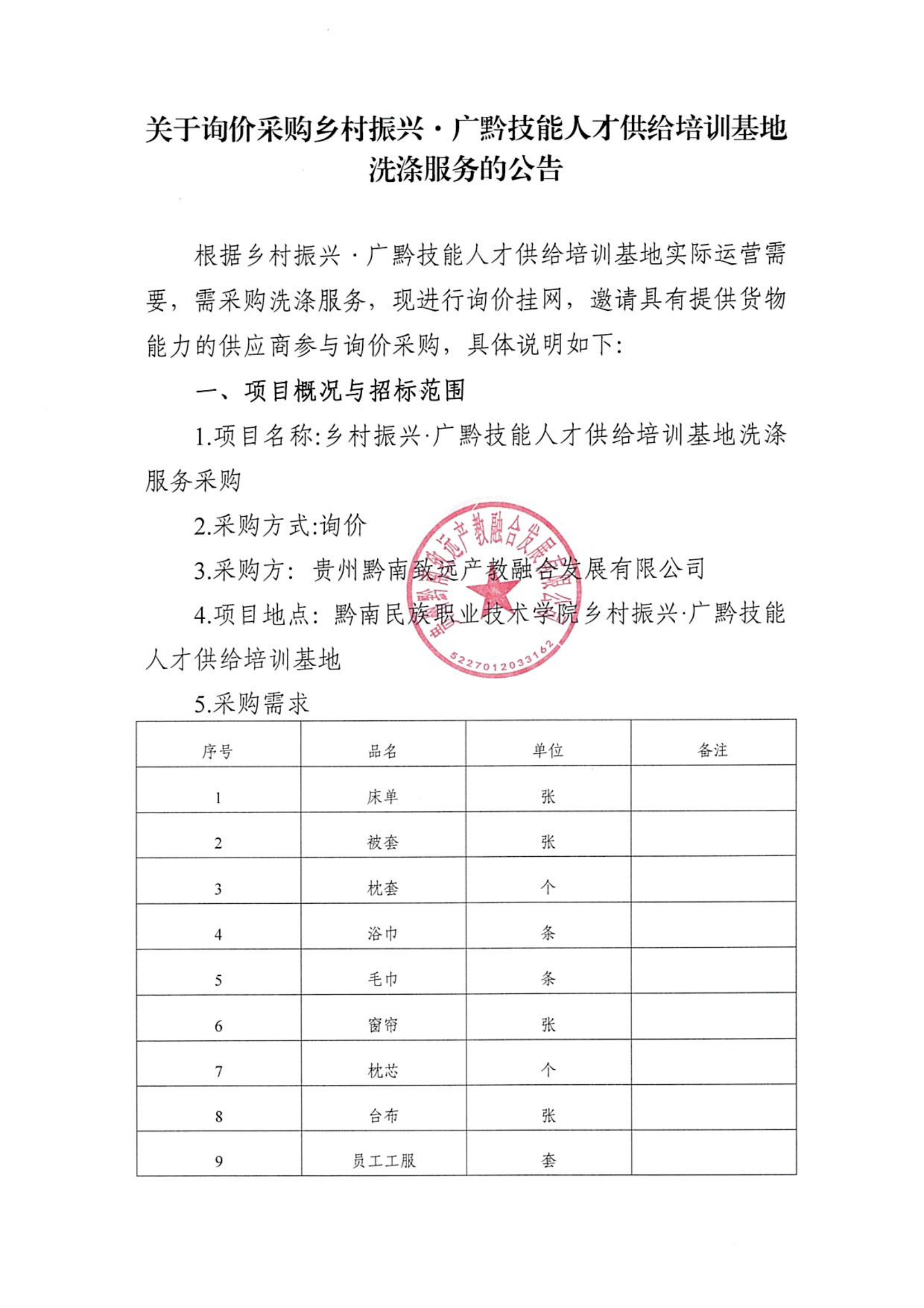 凡符合资格要求的供应商,请于2024年5月21日至5月23日17点前将报价单及需提供的资料密封加盖鲜章交至黔南民族职业技术学院广黔人才基地二楼贵州黔南致远产教融合发展有限公司综合办公室。