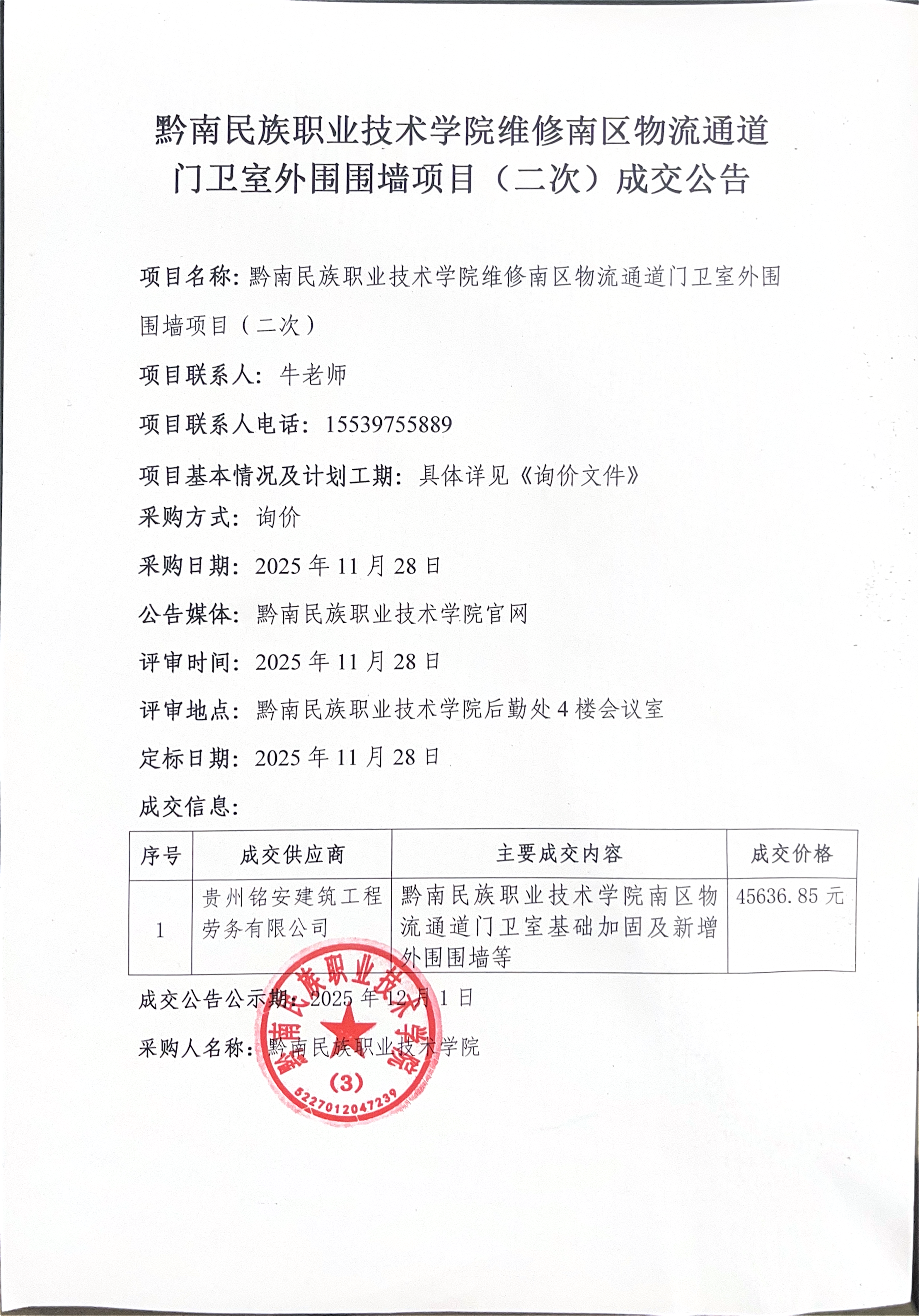 黔南民族职业技术学院维修南区物流通道门卫室外围围墙项目(二次)成交公告