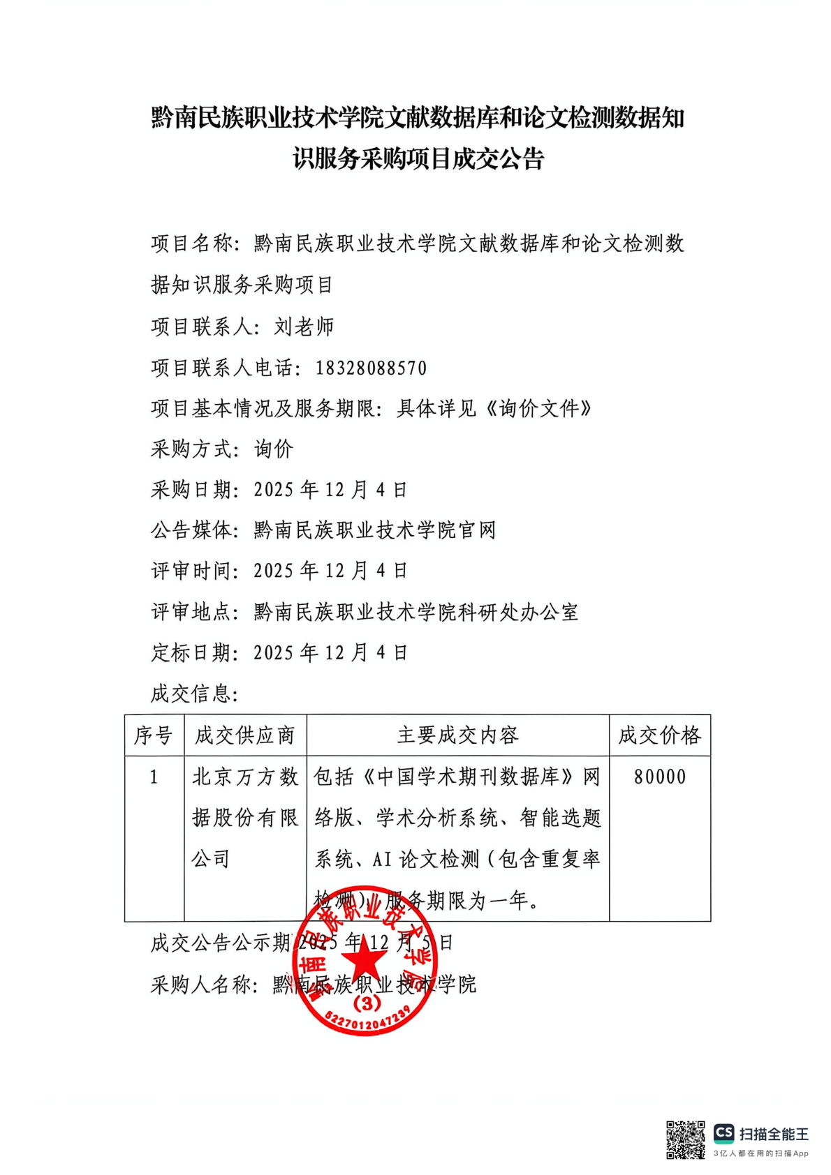 黔南民族职业技术学院文献数据库和论文检测数据知识服务采购项目成交公告