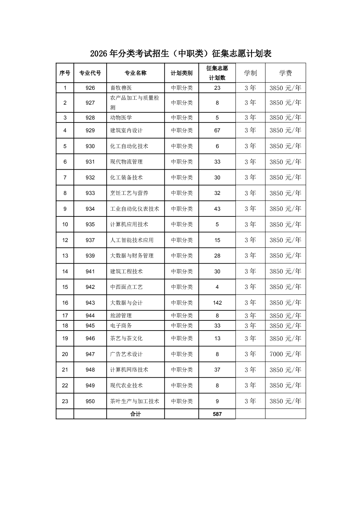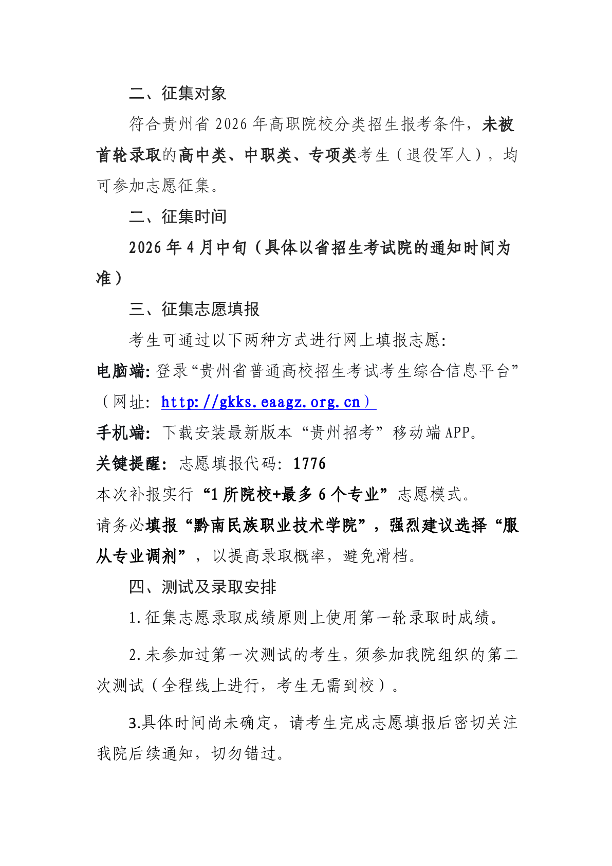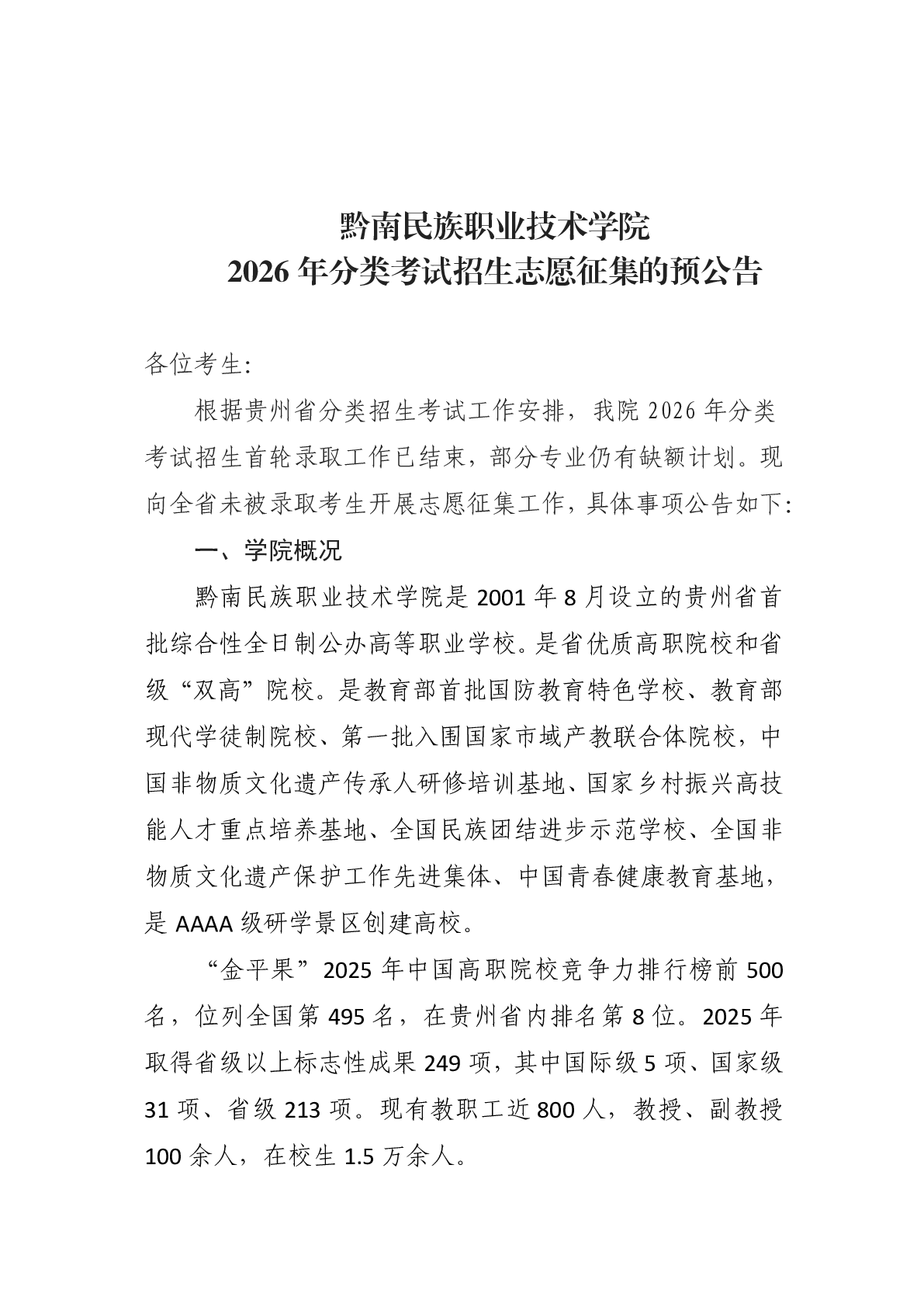 黔南民族职业技术学院2026年分类考试招生志愿征集的预公告