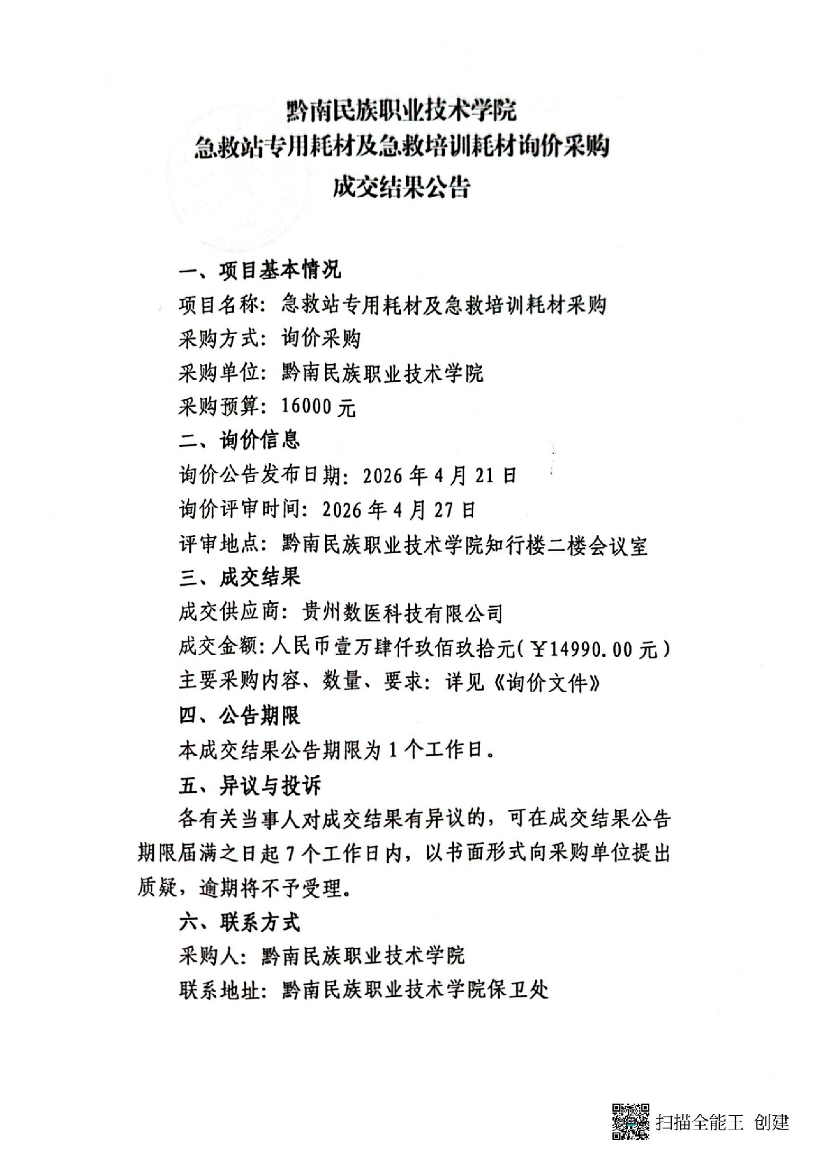 黔南民族职业技术学院急救站专用耗材及急救培训耗材询价采购成交结果公告