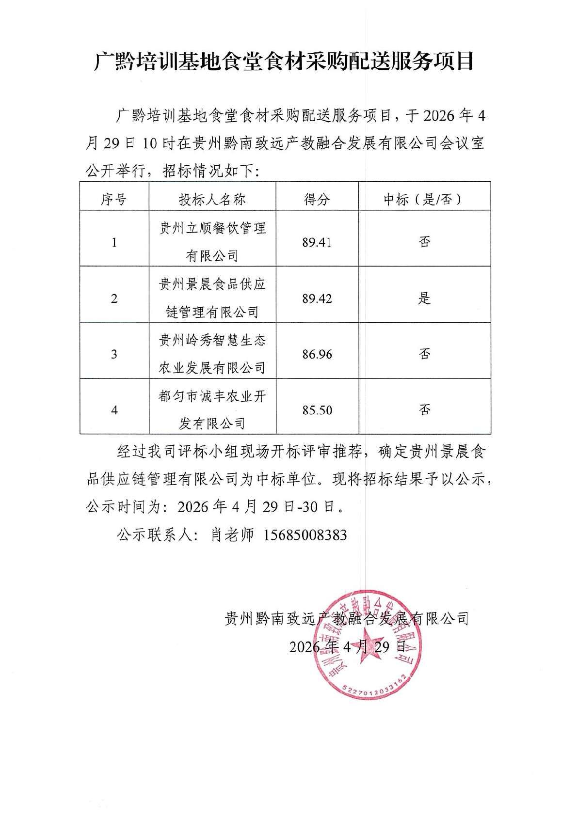 广黔培训基地食堂食材采购配送服务项目中标公告