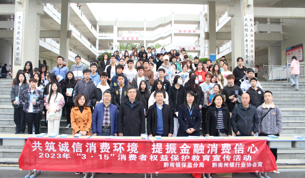 为培养大学生廉洁观念,提高在校大学生的金融风险防范意识和安全意识,加大对大学生金融风险识别提示,营造良好校园金融环境。3月22日上午,学院携手黔南州银行业协会常务副会长兼秘书长杨正刚,黔南银保监分局普惠金融科科长邵力力一行7人,在大数据楼前开展了金融知识集中宣传教育活动。