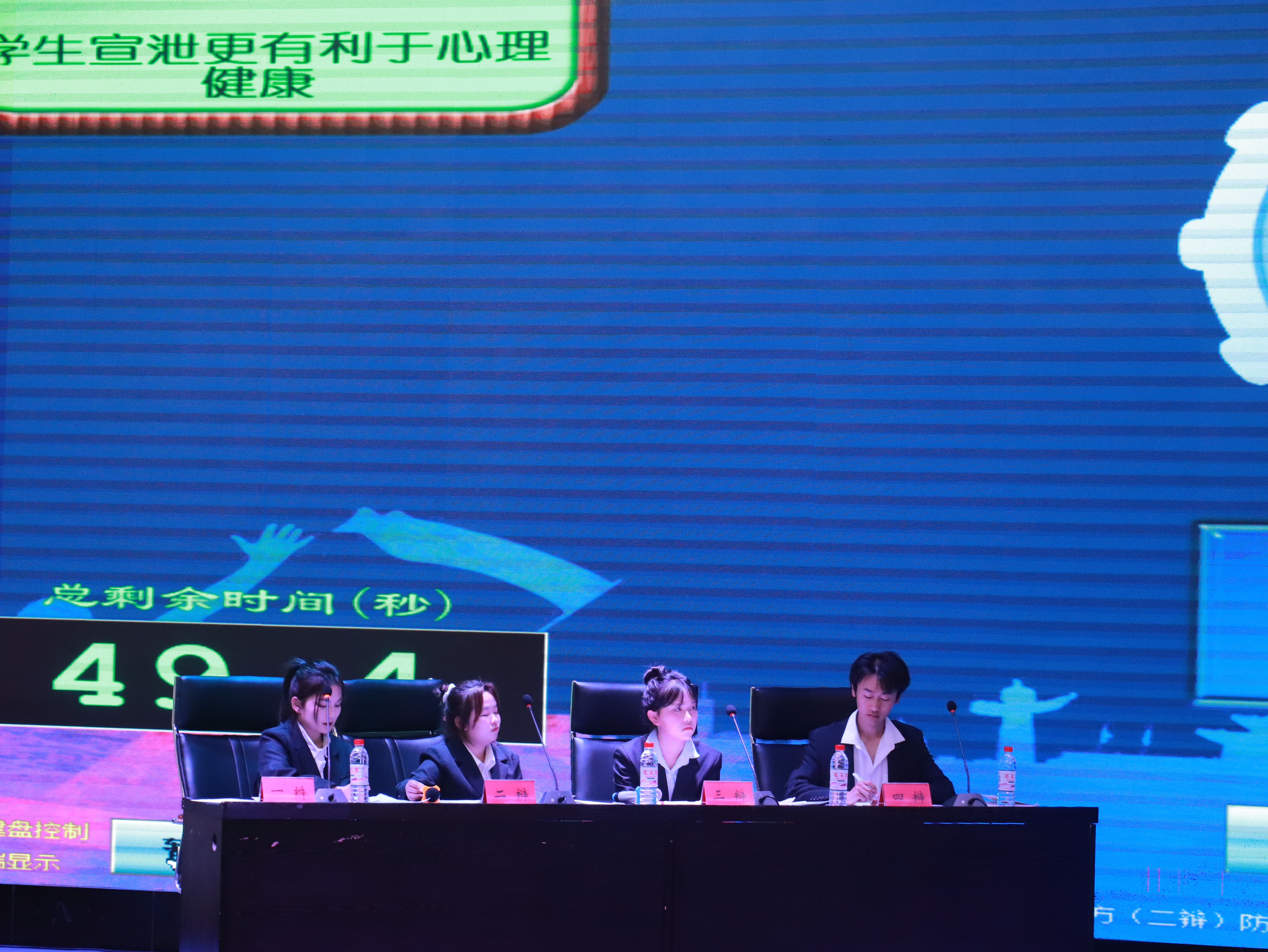 比赛紧紧围绕同学们关注的心理热点话题,通过“学生宣泄和控制谁更有利于心理健康?”、“大学生的负面情绪该不该藏起来?”和“大学期间是否该谈恋爱?”3个话题展开激烈的辩驳。整场比赛高潮迭起,精彩纷呈,各位辩手论点清晰明确、思维敏捷、唇枪舌战、妙语横生,却又不失风度,现场气氛迅速升温,将比赛推入高潮。在思维的碰撞与交锋中,充分展现了同学们缜密的思辨能力,娴熟的辩论技巧。同时,让同学们从中认识到失调情绪的危害,合理控制和释放情绪的重要性以及如何去建立正确地恋爱价值观。