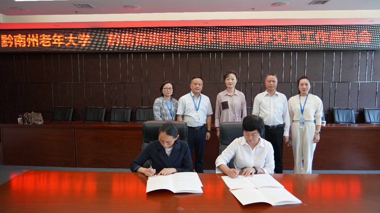 李华校长对学院给予黔南州老年大学的支持表示感谢。双方签订战略合作协议,由学院选派有爱心、有公益心的专业教师走进老年大学承担一定的教学工作。同时,学院也将以将老年大学作为实习实训基地,实现双方的共赢。