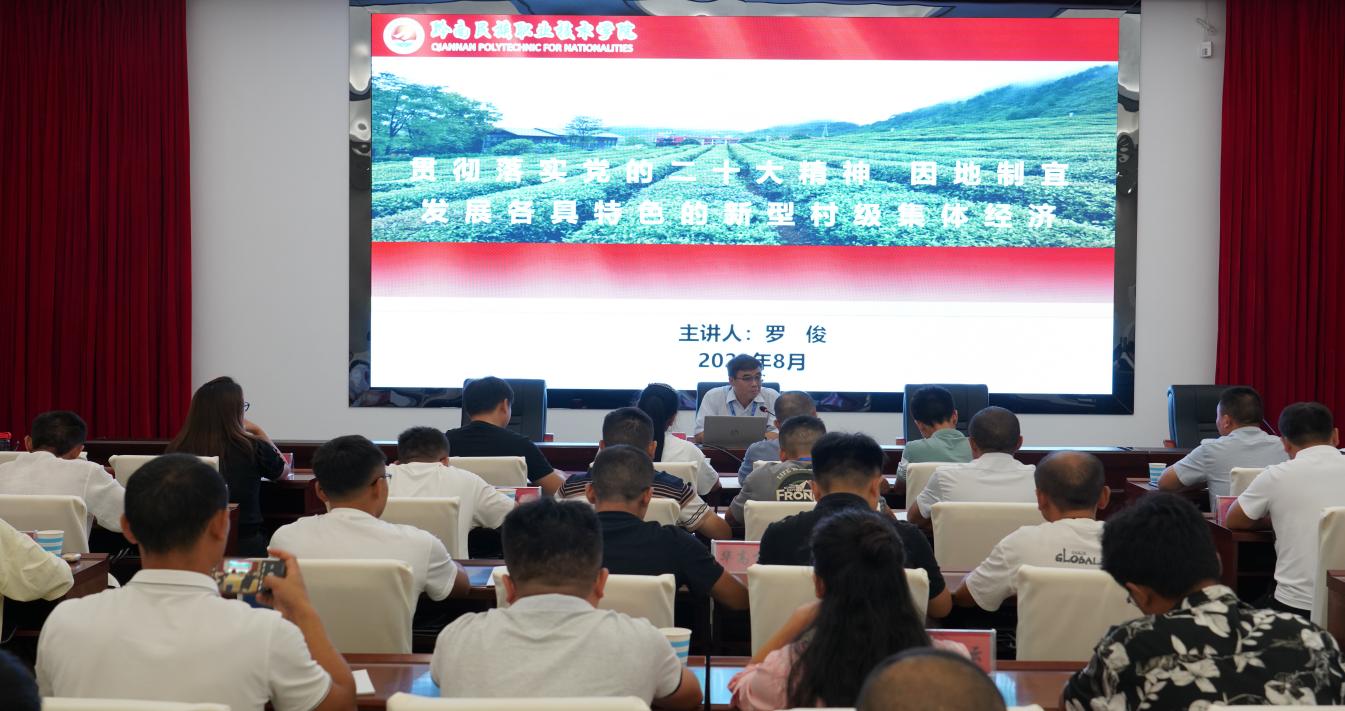 8月24日上午,学院党委书记罗俊同志以“贯彻落实党的二十大精神,因地制宜发展各具特色的村级集体经济”为题,拉开了黔南州农村集体经济组织负责人能力提升专题培训班在我院开班培训的序幕。